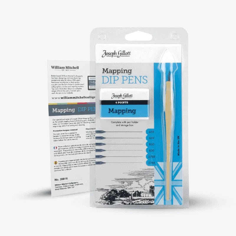William Mitchell Joseph Gillott Mapping Calligraphy Nibs Set. This exquisite set of finely crafted nibs is perfect for artists and calligraphers who seek precision and elegance in their work. Each nib is designed to deliver consistent ink flow and sharp, clean lines, making it ideal for detailed mapping, intricate illustrations, and beautiful calligraphy. With a variety of nib sizes included, this set offers the flexibility to create a range of line widths and styles, ensuring your artistic creations are always of the highest quality.